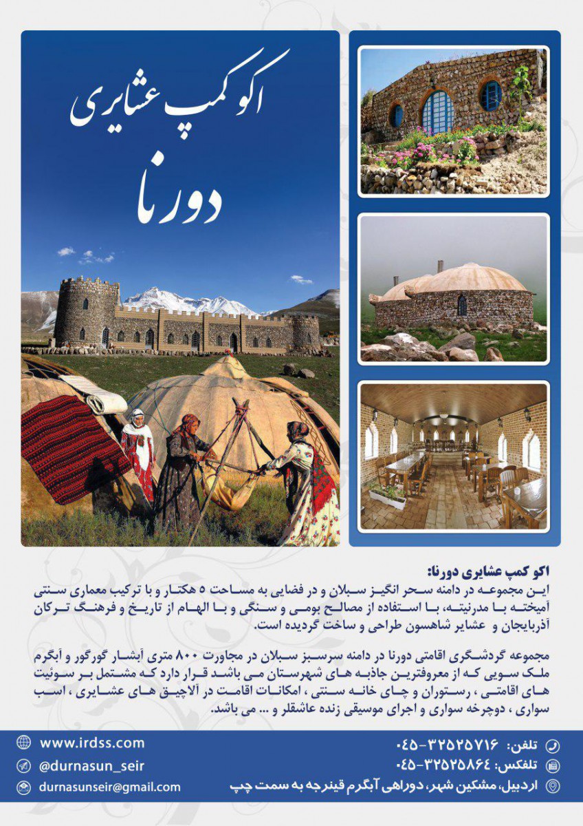 ۵ کیلومتری جنوب مشکین شهر، در دامنه سحر انگیز سبلان و در فضایی به مساحت ۲۰ اکو کمپ عشایری دورنا در هکتار و...قوانین اقامتگاه
