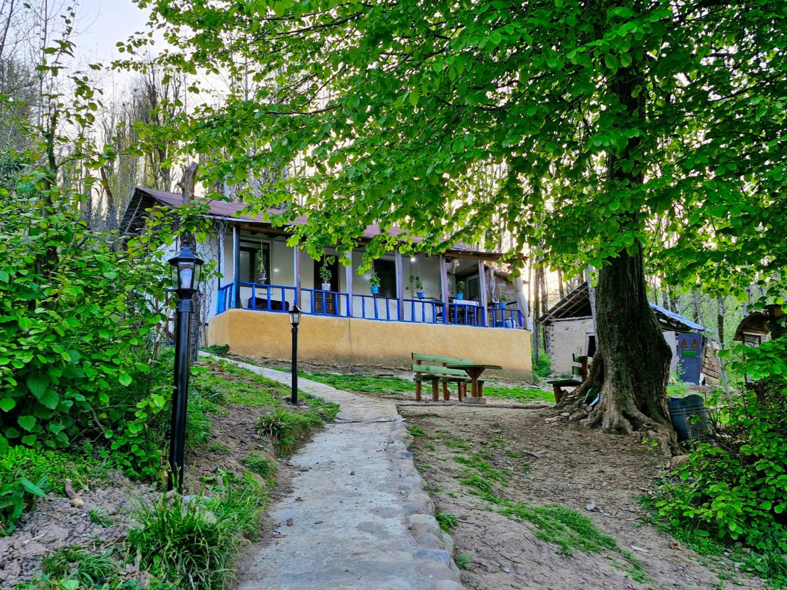 کلبه جنگلی نزدیک رودخانه و آبشار