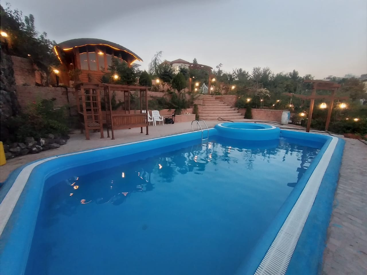 استخر چهار فصل با کلبه چوبی وسط باغ